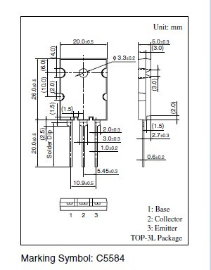 2SC5584 features: (1)High breakdown voltage, and high reliability through the use of a glass passivation layer; (2)High-speed switching; (3)Wide area of safe operation (ASO).