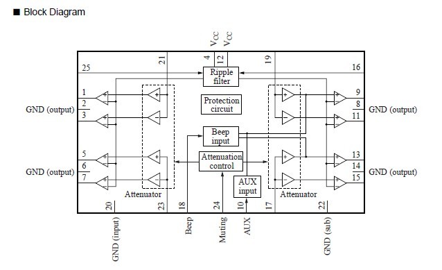 AN7555ZA features: (1)Built-in standby function (shock-noise free at STB-on/off); (2)Built-in muting function (shock-noise free at Mute-on/off); (3)External components reduction; (4)Provided with beep sound input pin; (5)Equipped with auxiliary sound input pin.